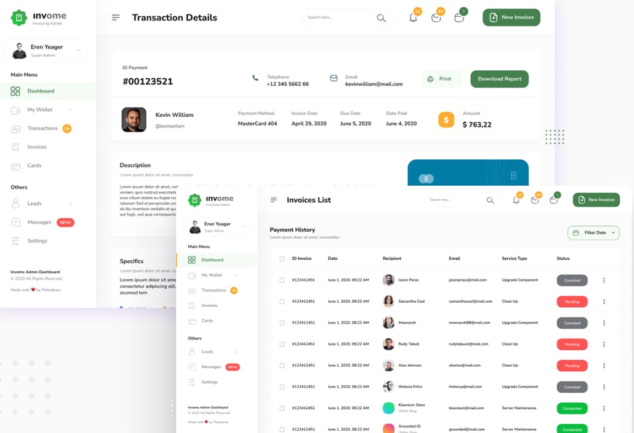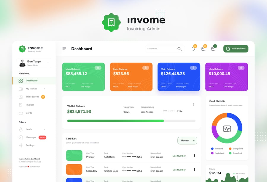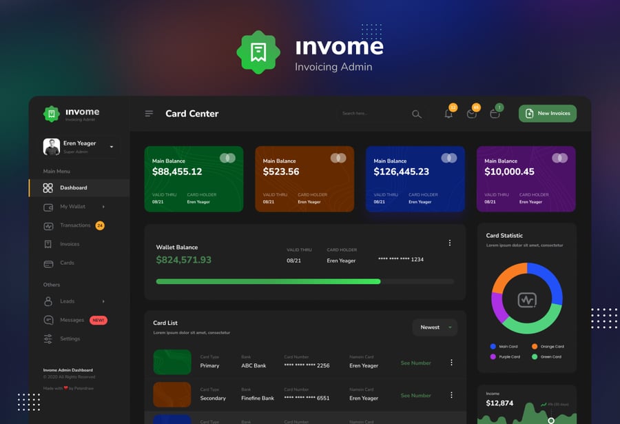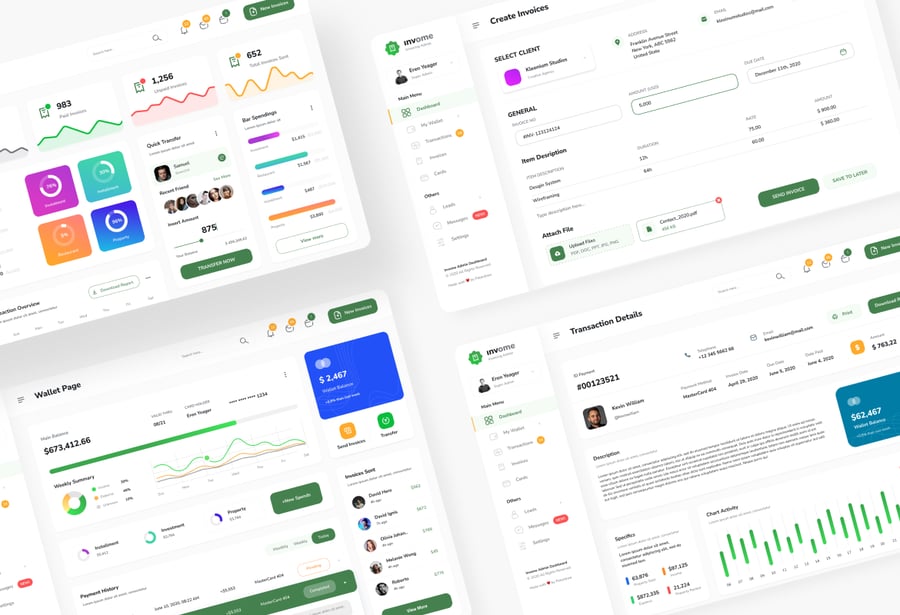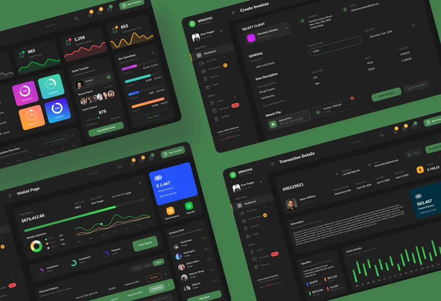 适用于发票管理后台的现代化仪表盘用户界面设计模板。此模板非常适合用于钱包仪表盘、创建发票、发票跟踪、交易管理以及任何后台管理仪表盘网站。
