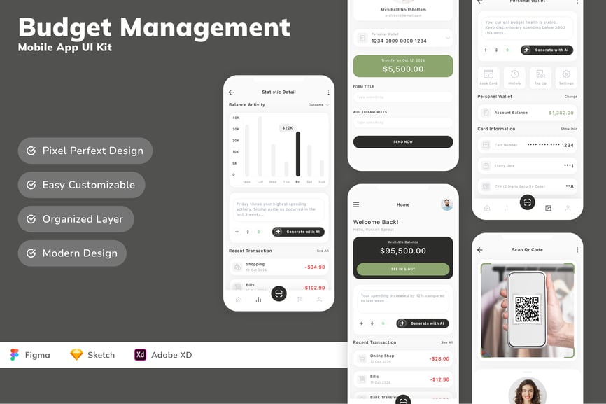 每个屏幕都可完全自定义,易于使用,并针对 Figma、Sketch 和 Adobe XD 进行了精心设计。