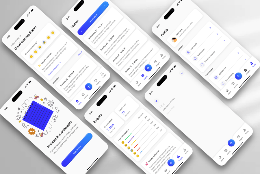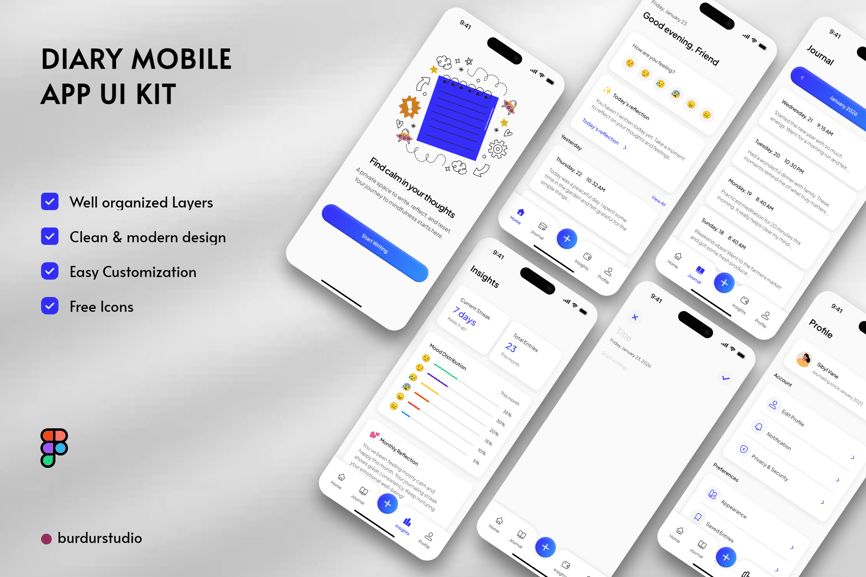 **日记移动应用UI套件** 易于定制,完美契合您的移动登录需求。您可以在Figma中编辑。轻松插入内容、更改颜色,所有模板均已包含在内,可直接分享给您的用户。完全兼容、可编辑且像素级精准。此外,所有模板都经过精心组织、命名和分组。