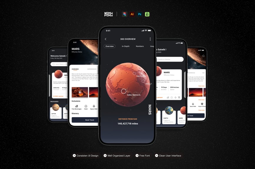 隆重推出**太空旅行**移动应用UI套件,这是一款现代化且功能全面的解决方案,可助您创建简洁易用的应用界面。对于希望加快设计流程的设计师和开发者而言,这款UI套件堪称完美之选,它将您所需的所有基本组件整合在一个井然有序的软件包中。