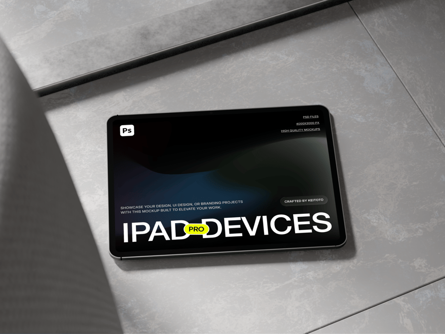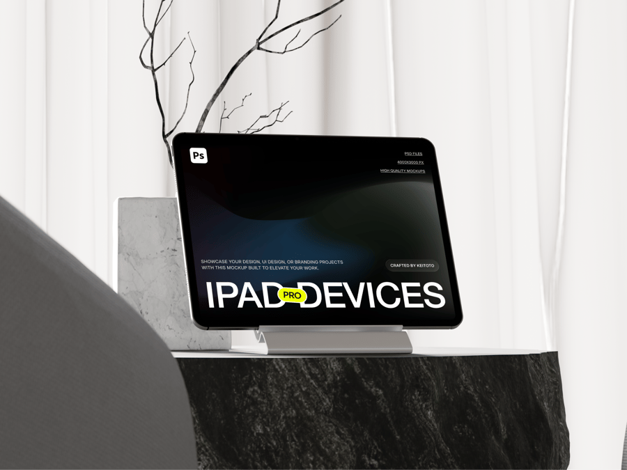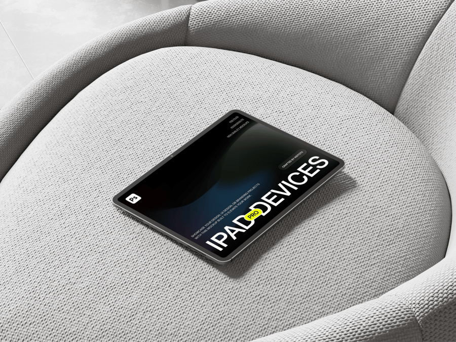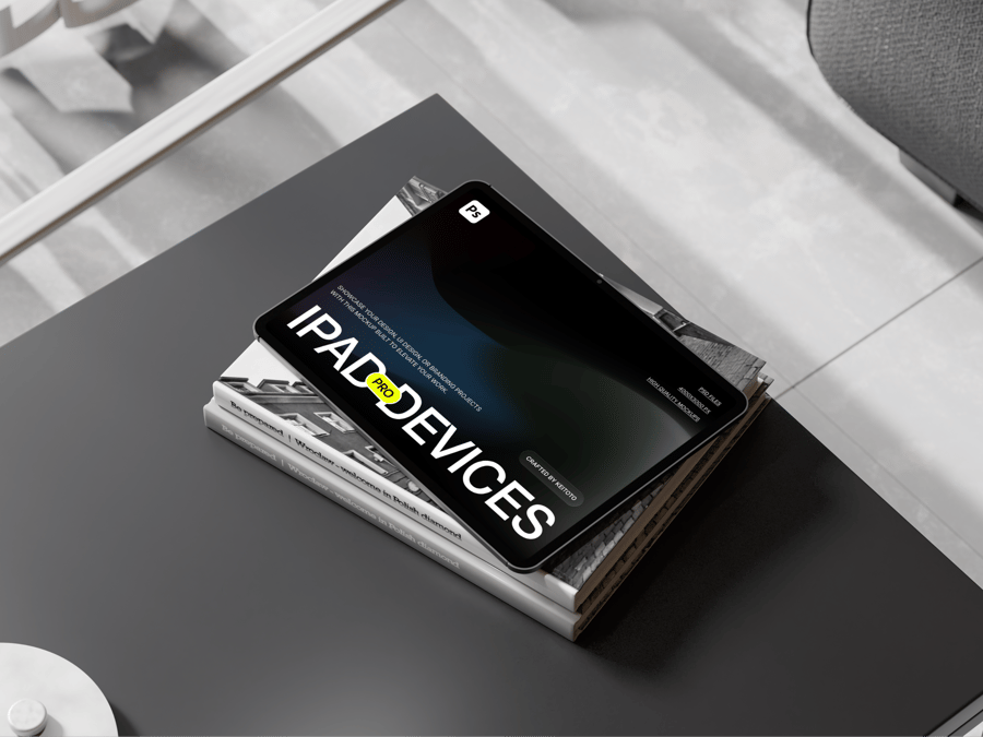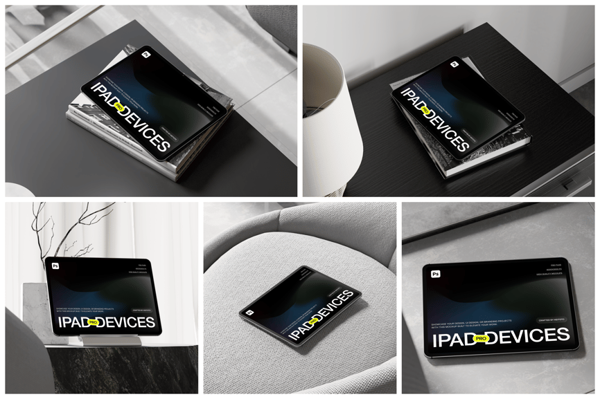 这套包含 5 款精美设计的 iPad Pro 平板电脑模型,置于现代家居室内环境中,搭配杂志配件和生活方式元素,可将您的设计栩栩如生地呈现出来,带来优雅的展示效果。