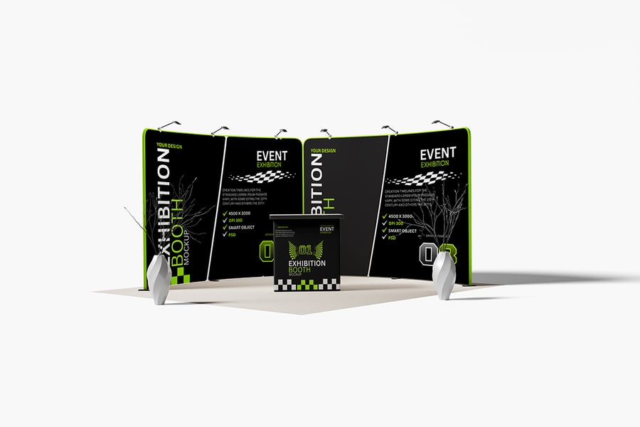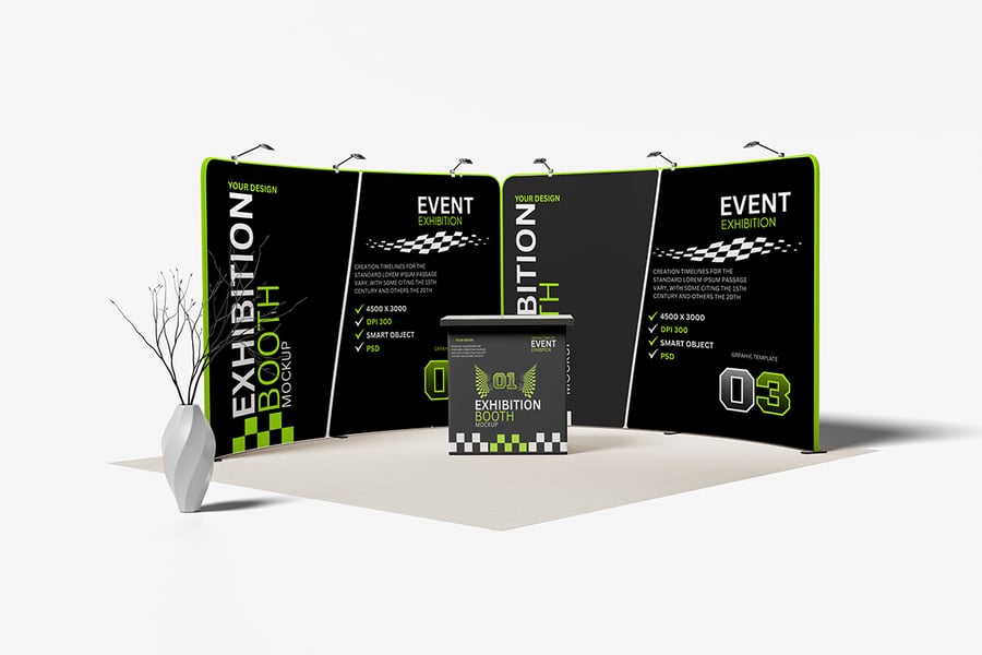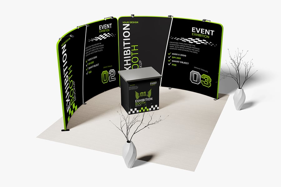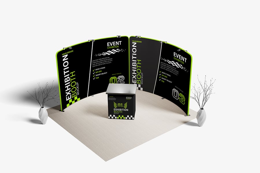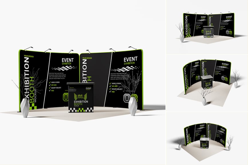 用这些精美的样机展示您的**高品质展位样机**。此样机包含 4 个元素,每个元素都配有分层清晰的 PSD 文件。此外,此样机还采用了智能对象功能,这意味着您只需几秒钟即可轻松快捷地将当前设计替换为您自己的设计。