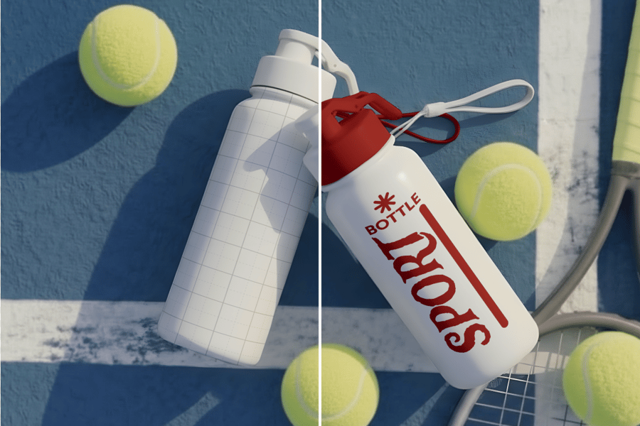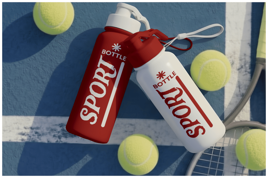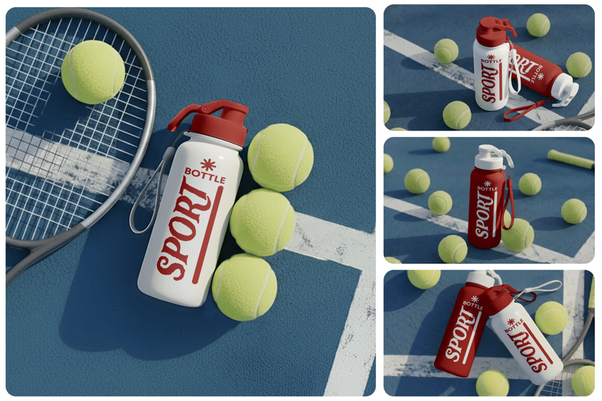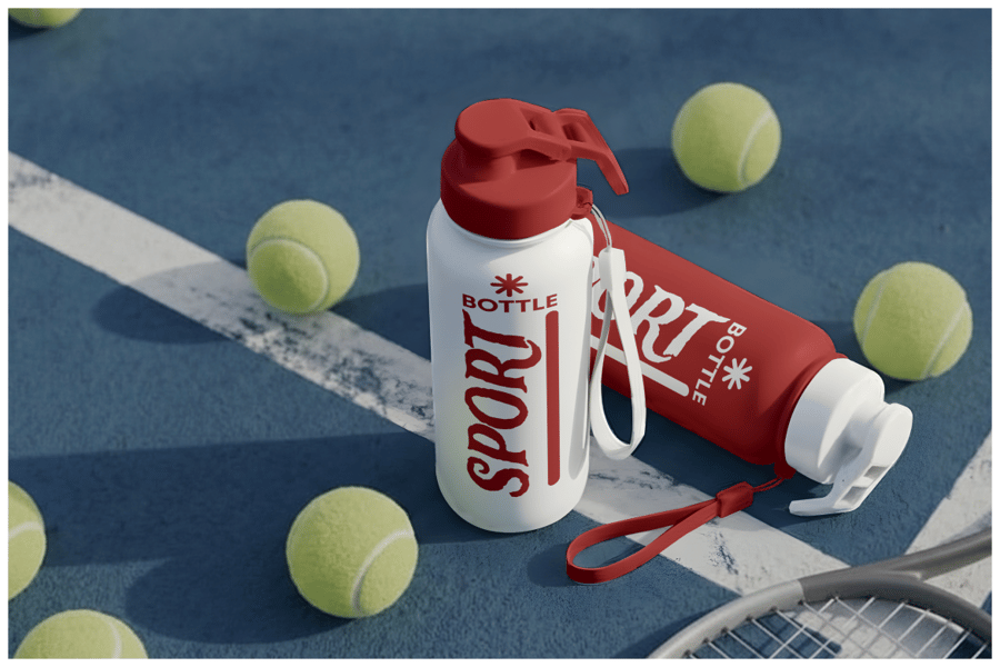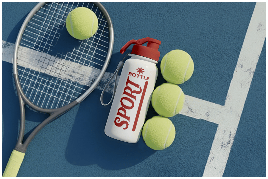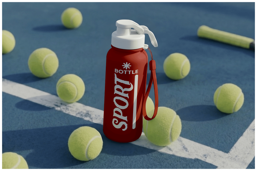 这款运动水瓶样机放置在网球场上,配有球拍和网球,营造出动感十足的运动场景,适用于产品品牌推广和市场营销演示。这款逼真的PSD模板展示了一款可重复使用的水瓶在运动环境中的形象,非常适合用于展示健身品牌的标志、标签和包装设计。