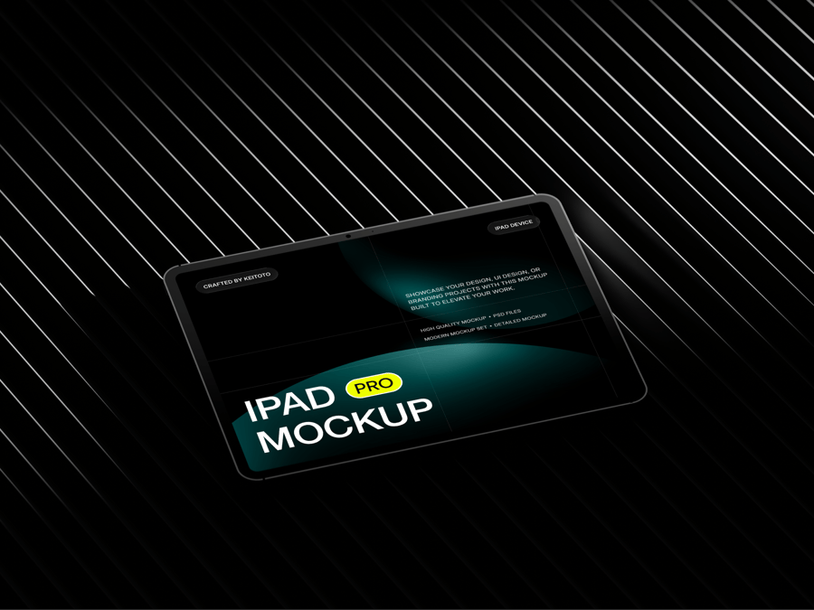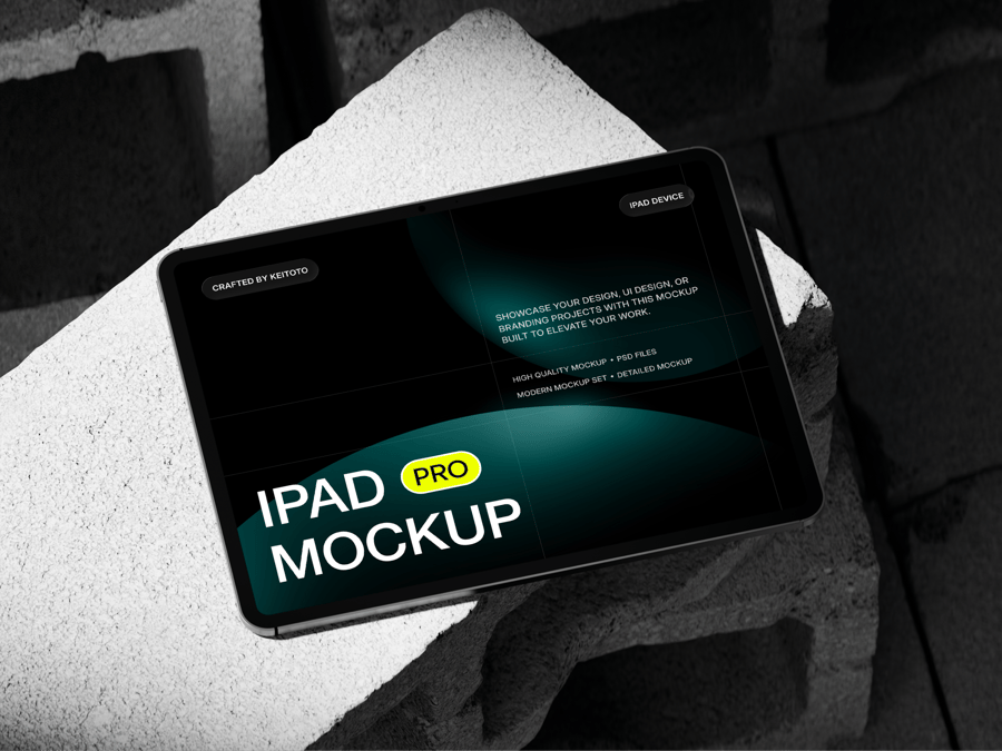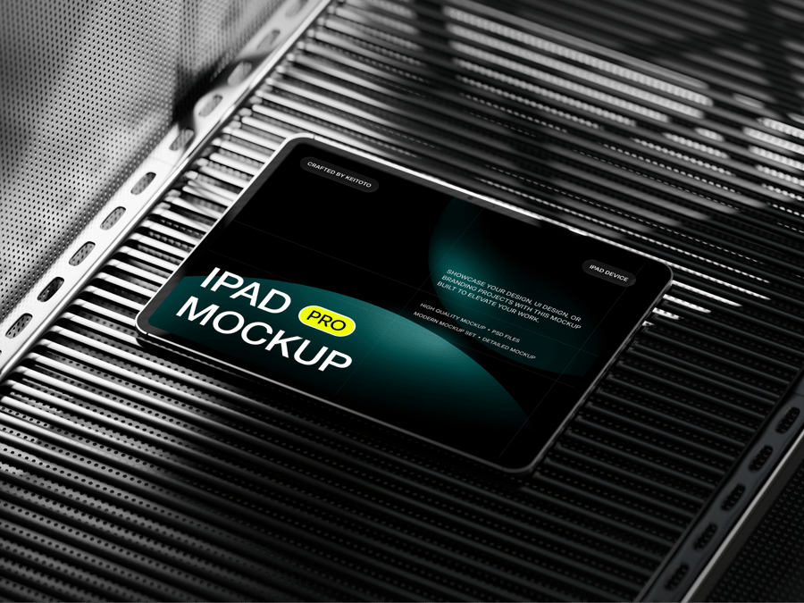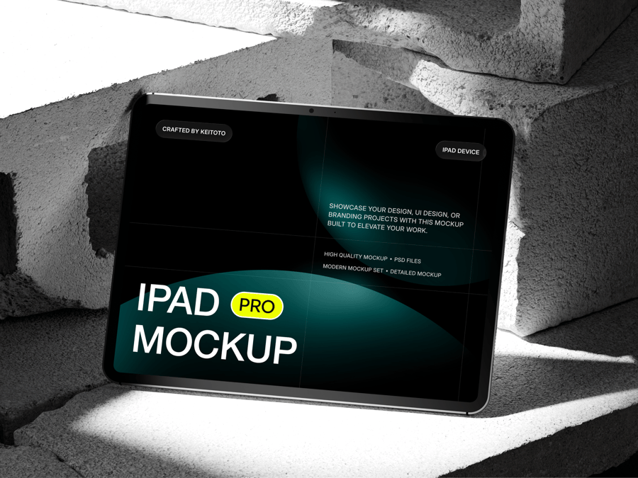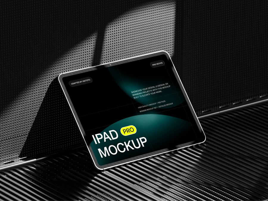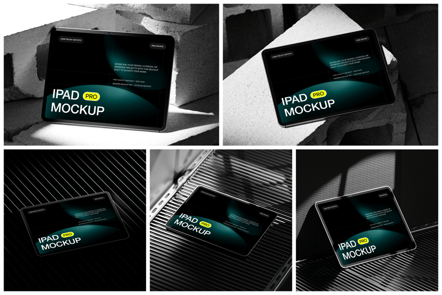 这五款模型展示了iPad Pro平板电脑在坚硬的混凝土表面和黑色金属工业背景上的不同角度呈现效果。这种现代简约的粗犷主义设计非常适合用于展示应用程序界面、网站设计或数字演示文稿。可自定义的屏幕和逼真的阴影效果使这款模型成为专业作品集、营销视觉素材和客户演示的理想之选。