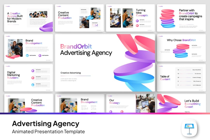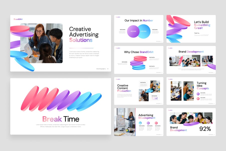 这款演示文稿采用现代创意设计,布局动感,字体醒目,视觉元素引人注目,旨在突出宣传理念和概念。它配备多种幻灯片布局,例如公司简介、代理服务、市场分析、宣传策略、项目时间表、绩效图表和信息图,以可视化的方式传递信息,使演示文稿更具吸引力、更专业、更易于理解。