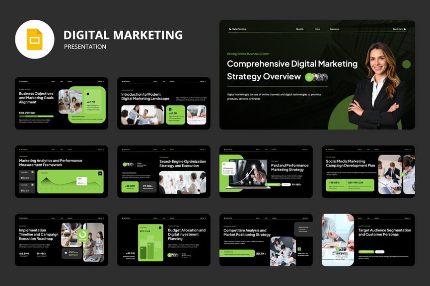 使用数字营销演示模板,将您的营销理念提升到一个新的水平。该模板是一套专业制作的幻灯片,旨在以清晰的视觉冲击力传达战略、绩效洞察和业务增长。