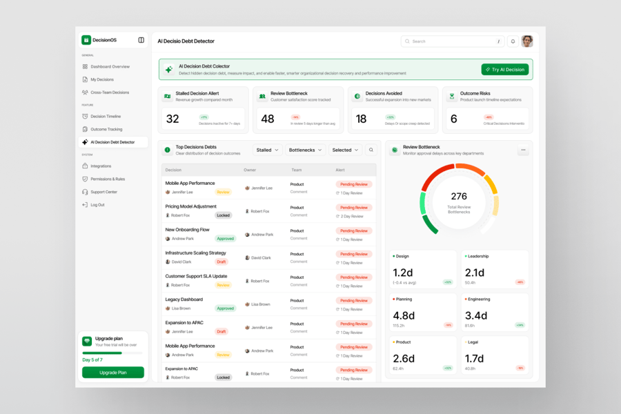 DecisionOS AI 决策债务检测器仪表盘是一款简洁现代的 SaaS 用户界面工具包,专为异步决策平台和组织智能工具而设计。该界面能够揭示隐藏的决策债务、审核瓶颈和停滞不前的决策,使团队能够清晰地了解情况,并在小延误演变成重大障碍之前采取行动。