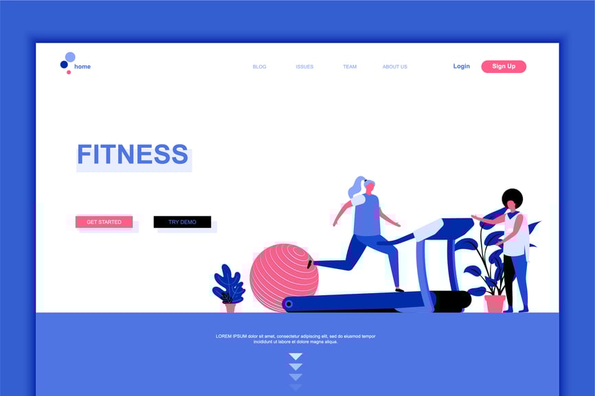 现代扁平化网页设计模板,以健身主题的装饰人物形象为特色,适用于网站和移动网站开发。扁平化落地页模板。矢量图。