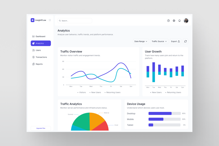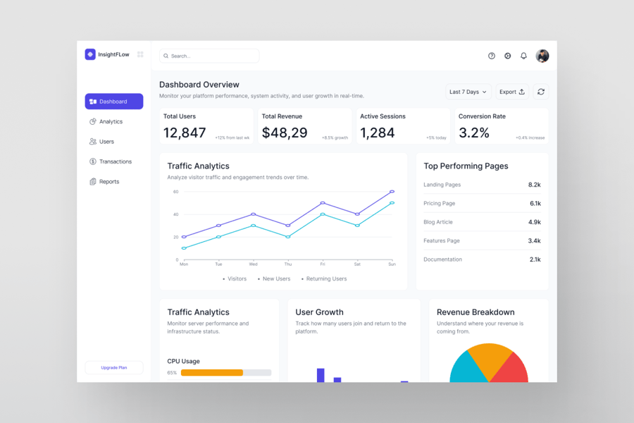 InsightFlow 管理面板仪表盘是一款简洁现代的 SaaS UI 套件,专为平台分析工具、管理面板系统和商业智能应用而设计。该套件包含两个完整设计的界面:仪表盘概览和分析,使平台团队能够全面了解流量趋势、用户增长、收入表现和设备使用情况。