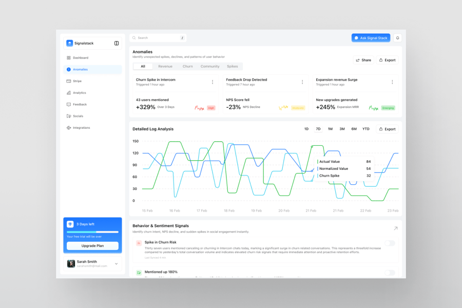 非常适合 UI/UX 设计师、SaaS 创始人以及构建异常检测平台、行为智能工具、客户流失预测仪表板或任何面向独立创始人及早期创业公司的 B2B SaaS 产品的产品团队,这些团队需要在关键信号变化演变成重大问题之前将其捕捉到。