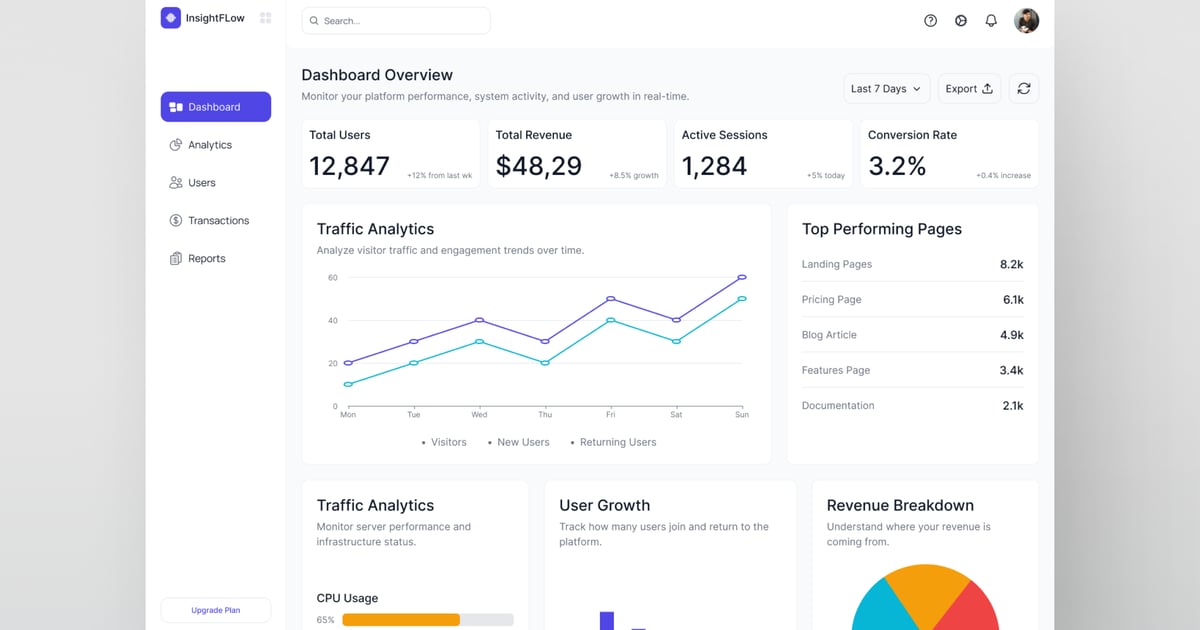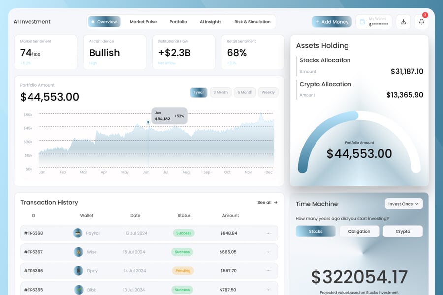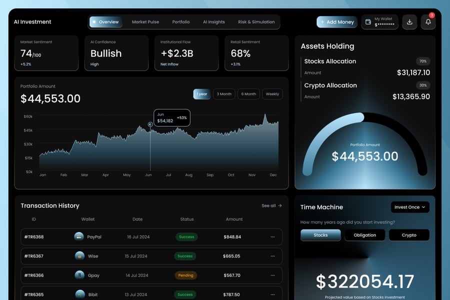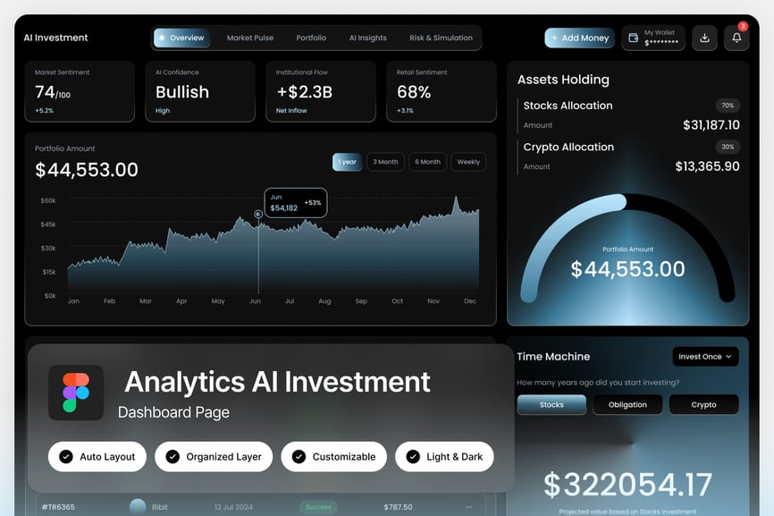 这款人工智能投资分析仪表盘采用未来感十足的金融界面,搭配精致的蓝色调视觉系统,将智能数据呈现与结构化布局完美融合。其设计亮点包括投资组合增长图表、人工智能驱动的洞察分析、资产配置可视化图表以及交易历史面板,所有信息均以清晰明了的分析流程呈现。该仪表盘基于 Figma 构建,所有组件均可编辑,并具备自动布局、图层组织和可扩展元素等功能,方便用户进行高效定制。它能帮助您以现代、简洁且数据驱动的视觉风格,展示人工智能驱动的金融平台、投资跟踪系统和预测分析。