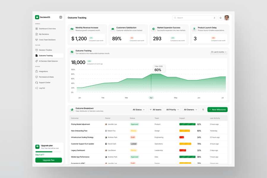 DecisionOS 结果跟踪仪表盘是一款简洁现代的 SaaS UI 套件,专为异步决策平台和业务成果智能工具而设计。该界面将决策与可衡量的业务成果关联起来,使产品团队和领导层能够全面了解收入影响、客户满意度和执行进度。