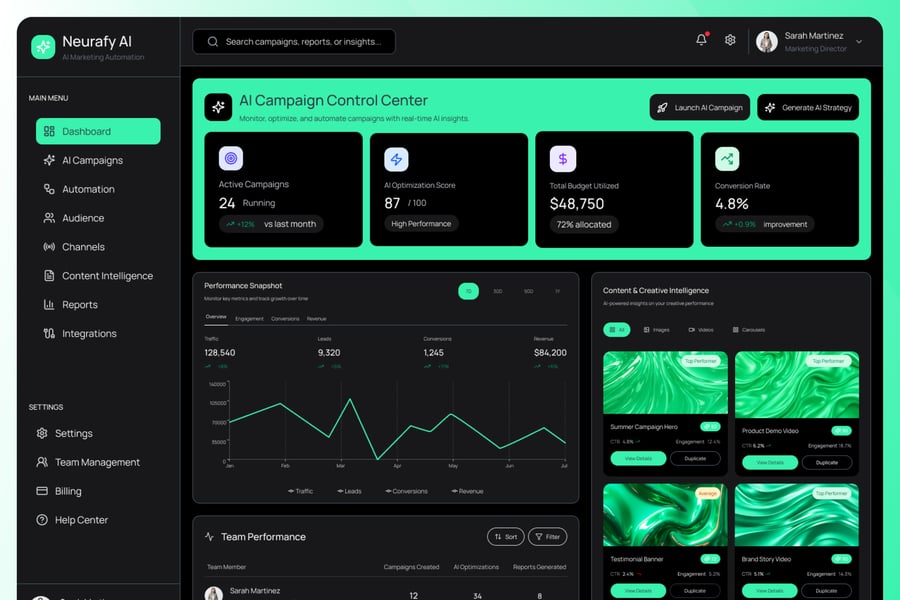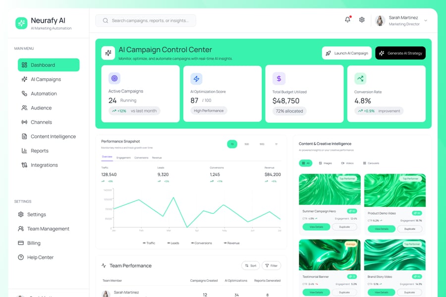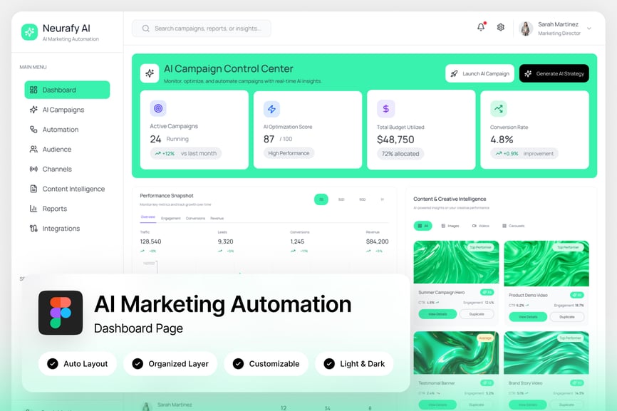 AI营销自动化仪表盘采用现代化的营销界面,以充满活力的绿色点缀,融合了结构化的布局和智能化的数据呈现方式。该设计包含活动绩效指标、AI优化洞察、内容智能面板和报告部分,并以简洁有序的仪表盘流程进行排列。它基于Figma构建,所有组件均可编辑,并包含自动布局、图层组织和可扩展元素,方便用户进行高效自定义。该仪表盘能够帮助您以清新、现代且专业的视觉风格展示AI驱动的营销平台、活动管理系统和分析工具。