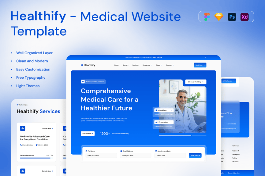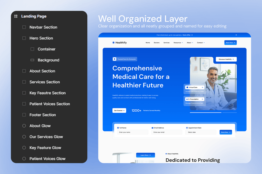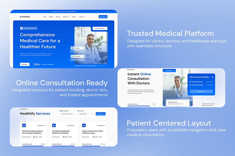 Healthify 的设计灵感源于现代医疗服务中信任、清晰和同理心的重要性。该模板旨在体现以患者为中心的理念——结合简洁的设计、柔和的视觉元素和结构化的信息流,帮助医疗服务提供者提供令人安心且专业的数字化体验。