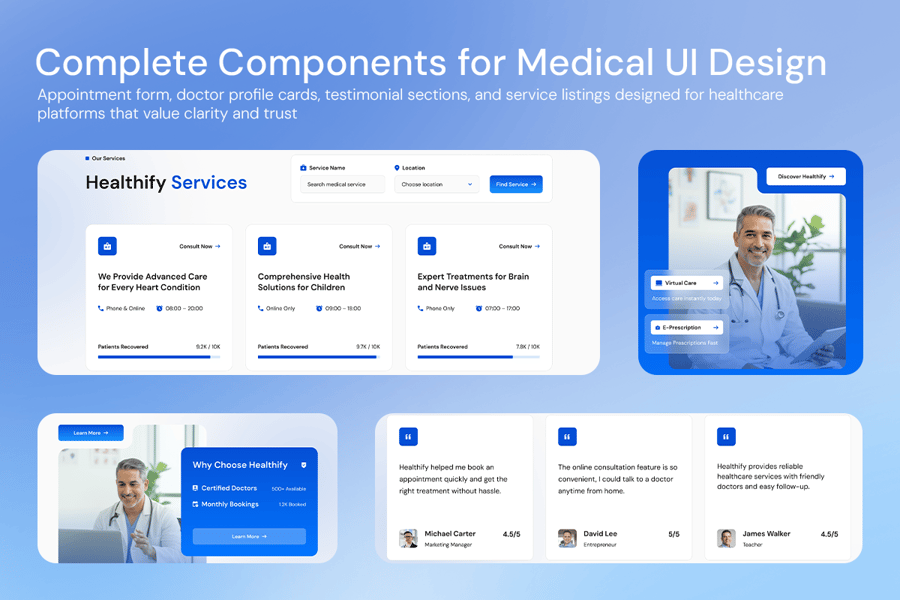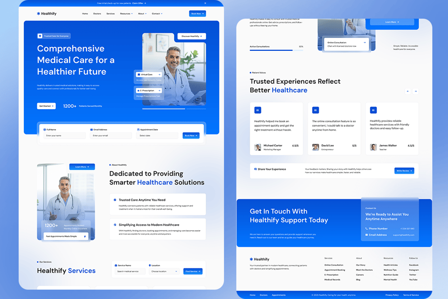 该布局旨在打造以服务为导向、以患者为中心的用户体验流程。从热情洋溢的首页介绍和服务亮点,到预约按钮、医生介绍和患者评价,**Healthify** 帮助访客预约咨询、了解治疗方案,并建立对医疗服务提供商的信任。