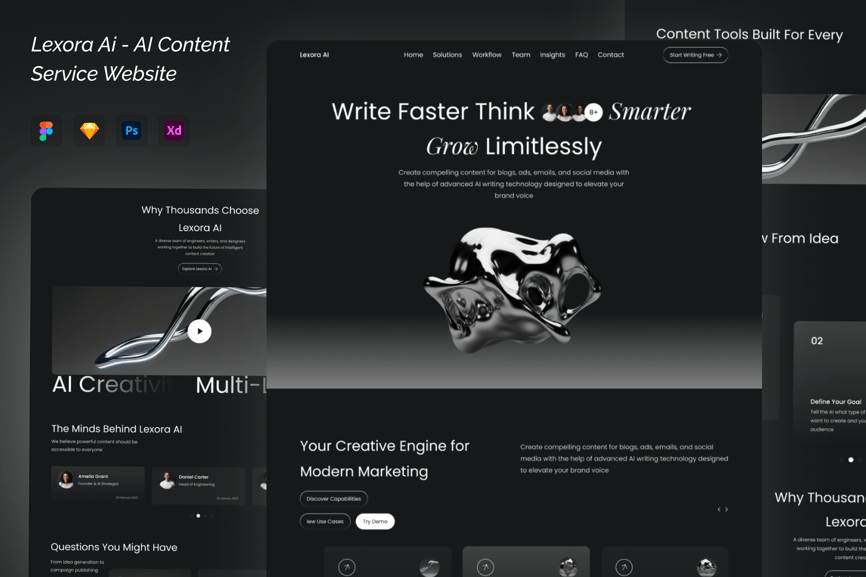 **Lexora Ai – AI 内容服务网站** 此模板简洁却不失专业现代感。您可以使用 **Figma、Adobe Photoshop、Adobe XD 和 Sketch** 进行编辑。轻松插入内容、更改颜色,所有模板均已包含在内,可直接与您的受众分享。所有组件均基于矢量图,完全兼容、可编辑且像素级精准。此外,它们组织有序、命名清晰、分组合理。