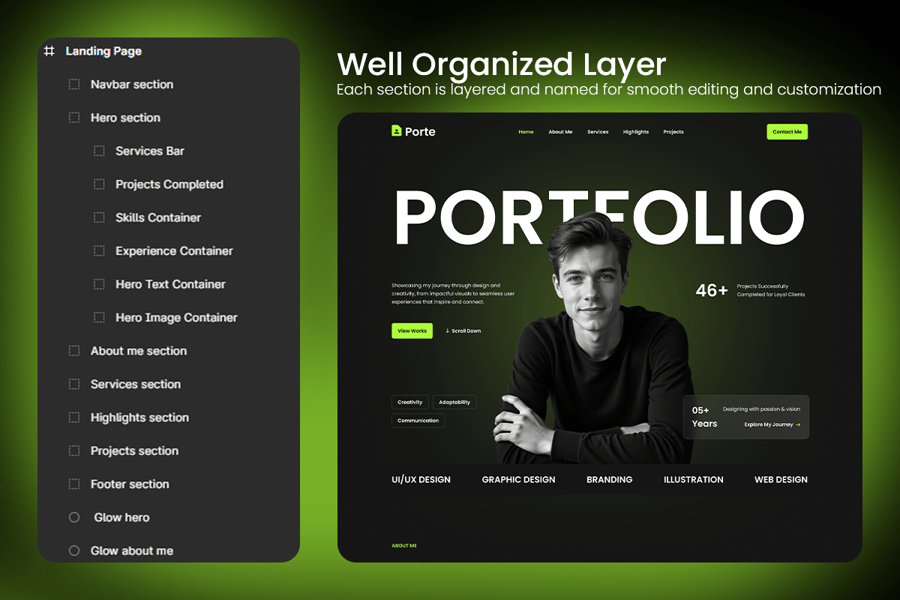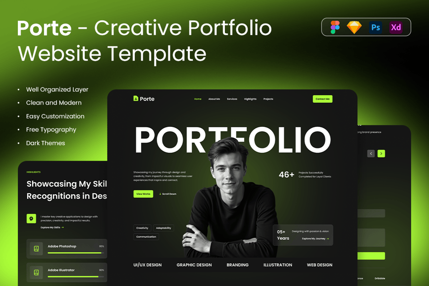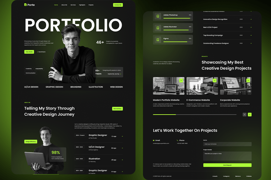 Porte 采用极简设计理念、均衡的字体排版和精心组织的版块,让创意人士能够以专业且引人入胜的方式展示他们的**作品集项目、设计过程、技能和个人故事**。其布局注重突出创意作品,同时保持现代优雅的美感。