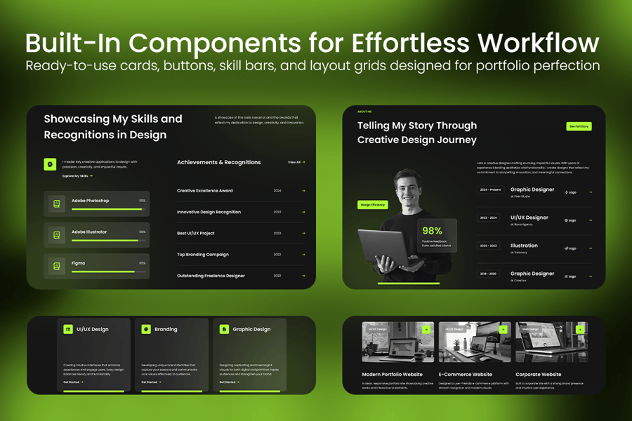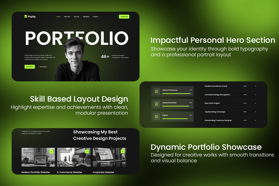 Porte 的灵感源于创意人士需要在简洁且引人注目的数字空间中展示作品的需求。该模板旨在营造精心策划的设计展示氛围——每个项目都经过精心设计、清晰呈现,并拥有强大的视觉叙事性——帮助设计师和自由职业者打造令人印象深刻的专业在线作品集。