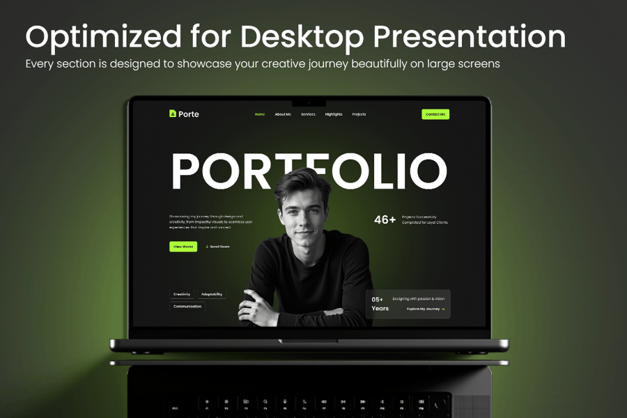 该模板旨在支持以作品集为主导、以展示为中心的用户体验流程。从引人注目的首页横幅和精选项目图库,到案例研究、客户评价和联系方式等号召性用语,**Porte** 引导访客浏览创意作品,同时鼓励合作、自由职业咨询和建立专业人脉。