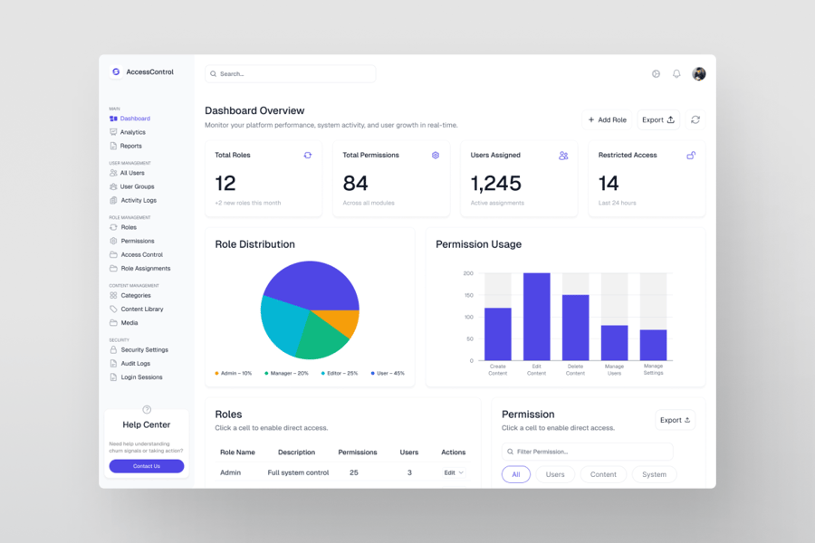 AccessControl 角色与权限管理仪表盘是一款简洁现代的 SaaS UI 工具包,专为用户访问管理平台、管理面板工具和多角色 SaaS 应用而设计。此概览界面让平台管理员能够全面了解角色分配、权限使用情况、用户分配和受限访问活动——所有信息都集中在一个结构化的布局中。