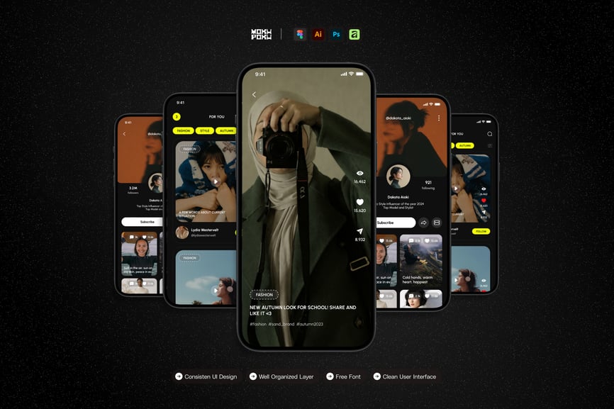 这款**社交视频** UI 套件的设计重点在于易用性和一致性,让您轻松创建美观实用的移动应用。每个元素都经过精心构建,完全可定制,并可根据您的品牌进行调整。无论您是设计社交应用、电商应用还是效率工具,这款套件都能让您灵活地将创意变为现实。