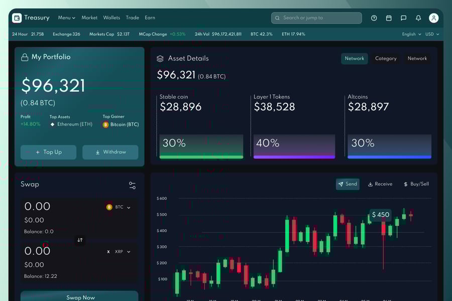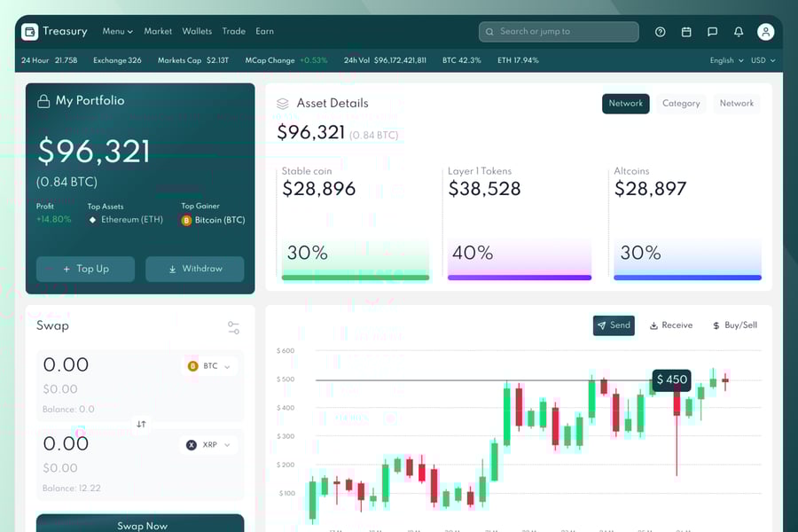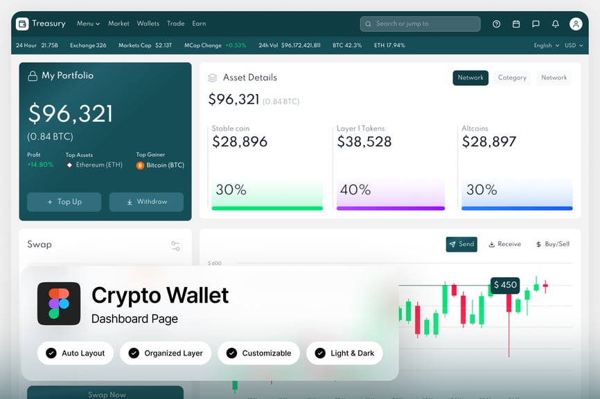 加密钱包仪表盘采用现代化的金融界面,以简洁的青色视觉系统为主,融合了结构化的布局和丰富的数据可视化。该设计包含投资组合概览、资产分布、兑换功能和实时交易图表,并以清晰直观的仪表盘流程呈现。它基于 Figma 构建,所有组件均可编辑,并具备自动布局、图层组织和可扩展元素,方便用户进行高效自定义。该仪表盘能够帮助您以现代、专业且数据驱动的视觉风格展示加密平台、数字资产管理和交易体验。