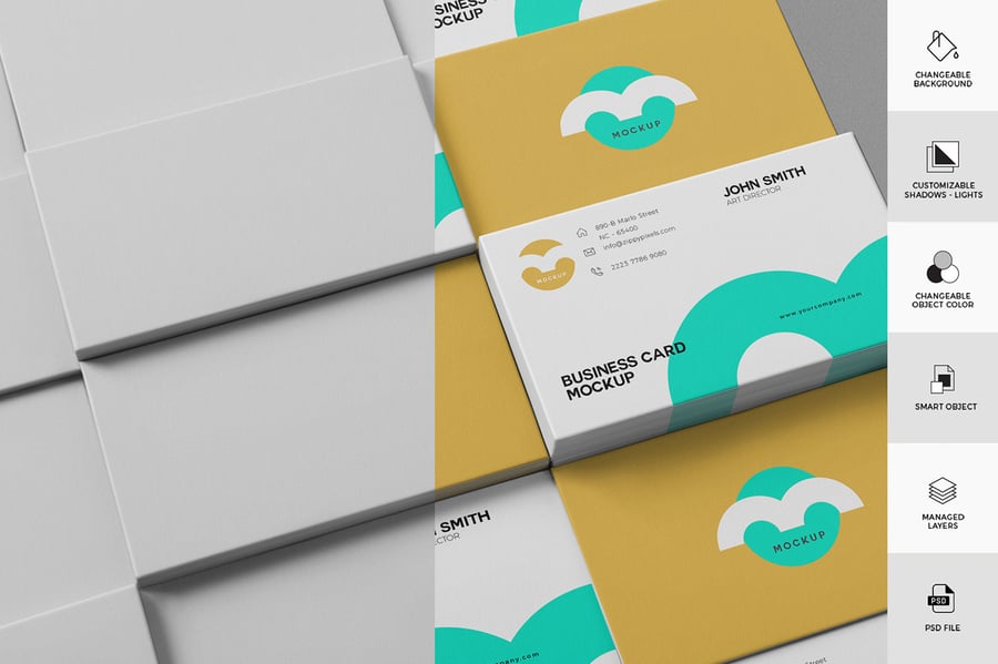使用这款简洁时尚的名片样机,以优雅的方式展示您的名片设计。让您的名片样机脱颖而出!只需几秒钟,即可为您的客户创建逼真的名片样机展示。这些 PSD 文件采用智能对象功能,因此您可以轻松快捷地替换样机内容。操作非常简单!只需双击智能对象,粘贴您的设计稿,保存即可。