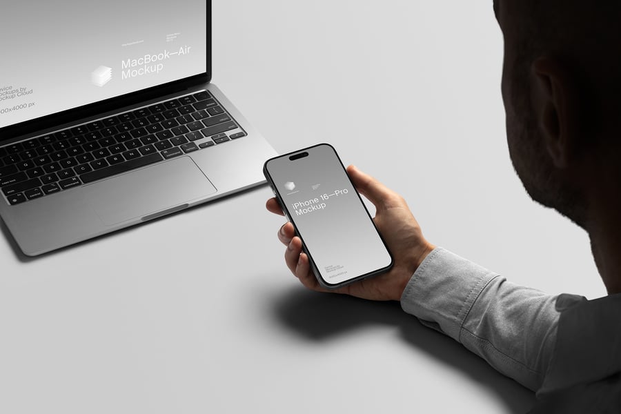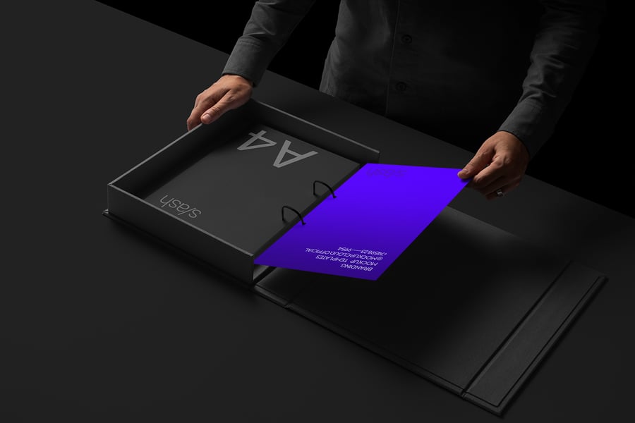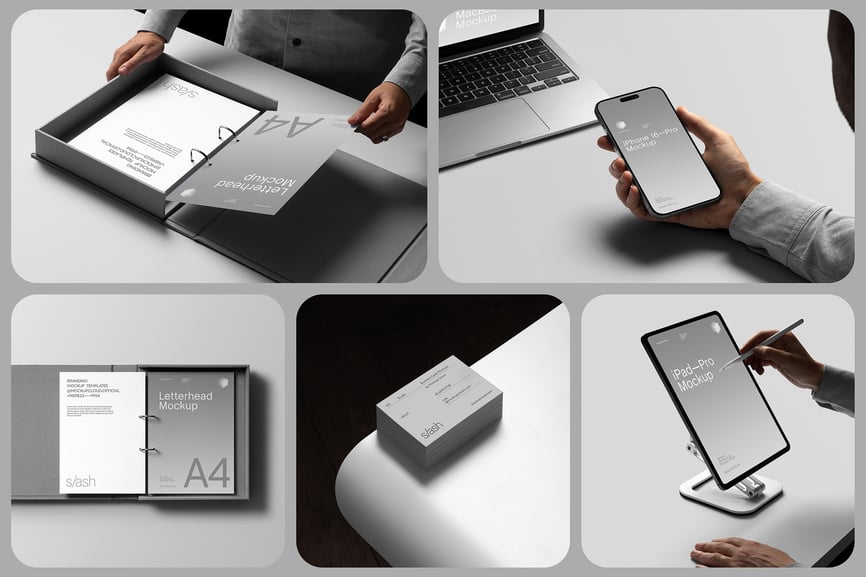 **6 张清晰的图片样机,包含各种品牌宣传品和数码设备:活页夹、包装文件夹、A4 信纸、名片、iPhone Pro、带支架的 iPad Pro、MacBook Air。**