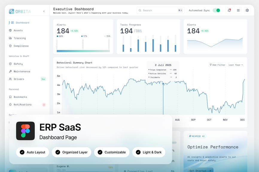 ERP SaaS 仪表盘采用简洁的企业级界面,搭配淡雅的蓝色调视觉系统,兼具结构化布局和数据导向的呈现方式。其设计包含运营指标、任务进度跟踪、行为分析图表和绩效面板,并以清晰有序的仪表盘流程呈现。该仪表盘基于 Figma 构建,所有组件均可编辑,并具备自动布局、图层组织和可扩展元素,方便用户进行高效定制。它能帮助您以现代、简约且专业的视觉风格展示业务管理系统、企业平台和 SaaS 分析。