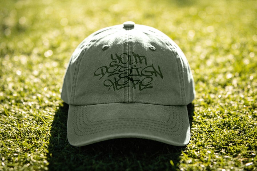 该模型展示了一顶正面朝上的棒球帽,直接放置在阳光强烈的草地上。照片突出了帽檐的弧度、缝制的帽片、顶部的纽扣、透气孔以及柔软的面料质感,自然的阴影和明亮的高光使刺绣区域清晰可见。