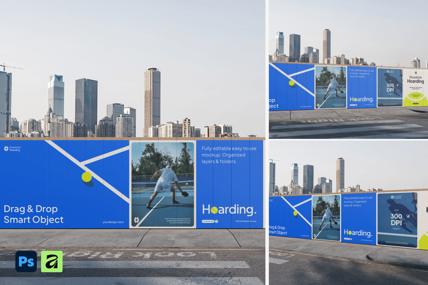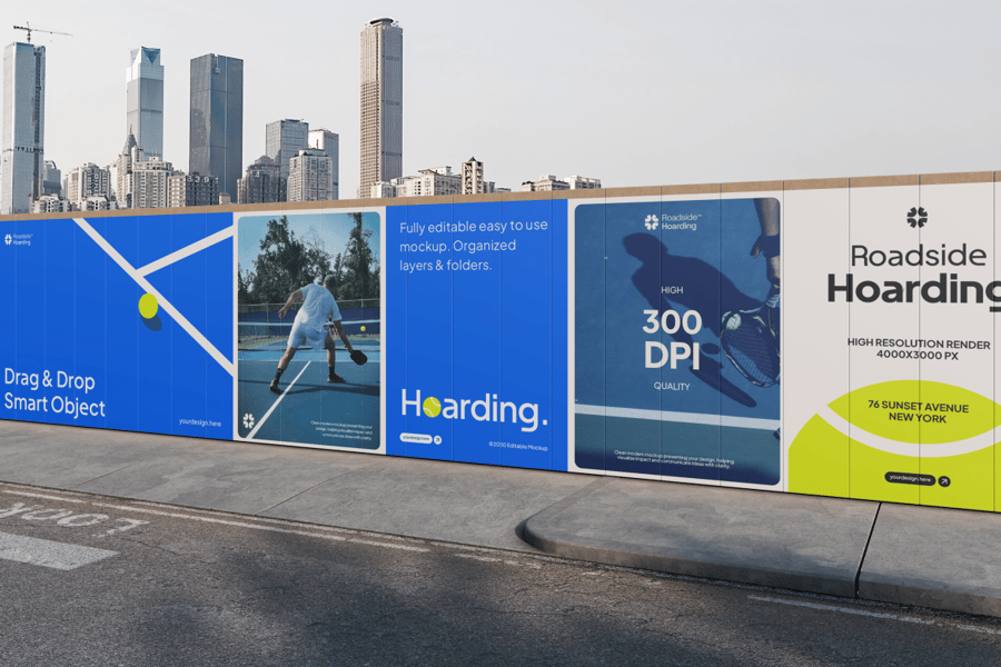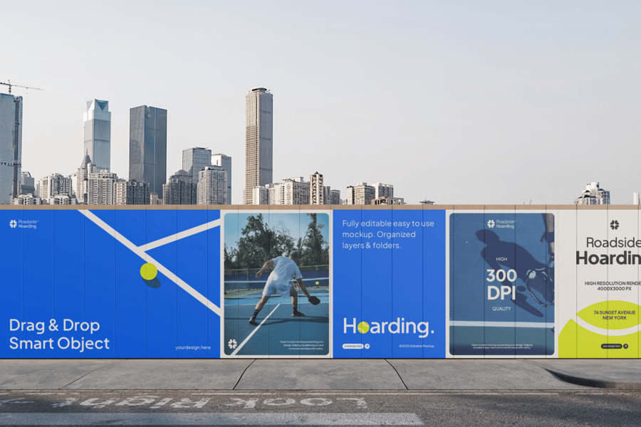 以城市天际线为背景的城市围挡模型对于动态户外宣传尤为有效,它通过将您的作品直接置于真实的城市环境中,提供了一种比平面预览更具视觉冲击力的替代方案。