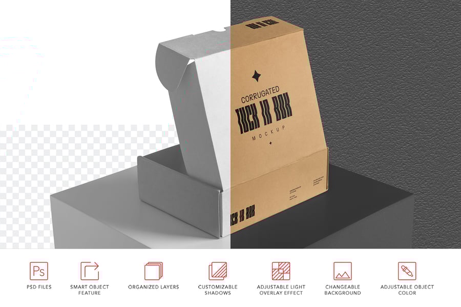 这款瓦楞纸盒样机提供了一个多功能的平台,让您充分展现创意和细节,确保您的设计在任何方案中脱颖而出。凭借便捷的自定义功能和高分辨率输出,这款纸盒样机是有效展示作品并获得客户认可的必备工具。