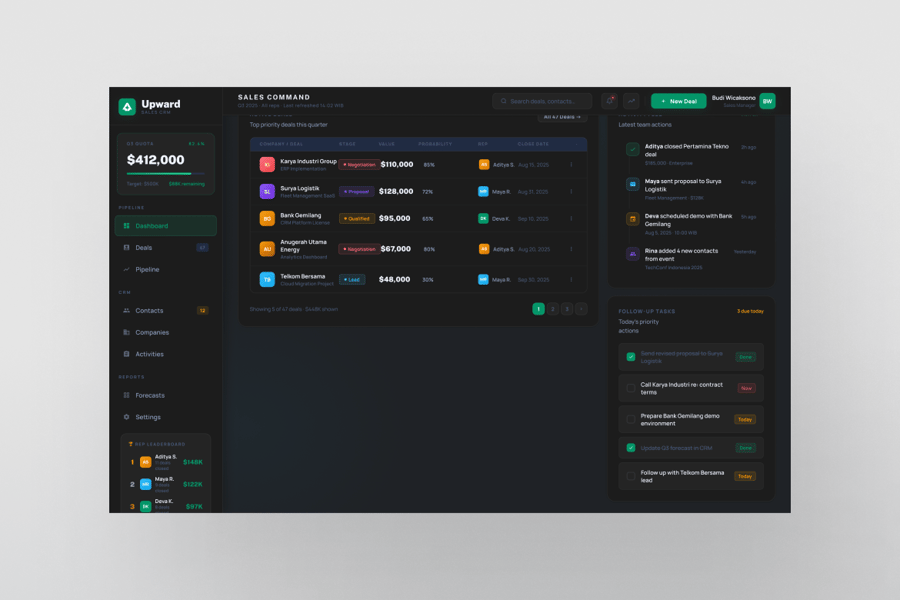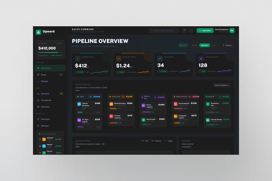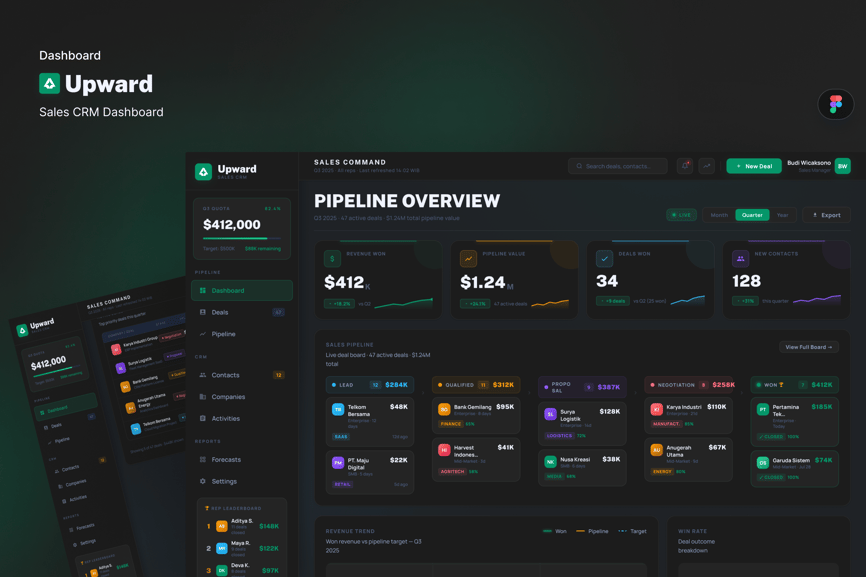 Upward 是一款高级销售 CRM 控制面板 UI 套件,旨在为销售团队和企业主提供可执行的洞察。该模板提供了一个高保真界面,用于在一个简洁专业的视图中管理销售线索、跟踪销售渠道并监控团队绩效。
