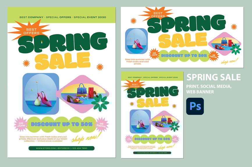 这款充满活力、趣味十足的春季促销套装,将为您的季节性营销活动注入强劲动力。它采用时尚的“柔和流行”美学设计,搭配醒目的气泡字体和复古几何图形,这款多功能套装旨在吸引眼球。充满活力的绿色、黄色和粉色配色,完美诠释了春夏的清新气息。