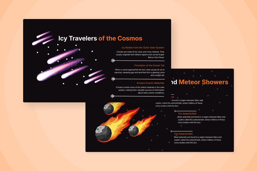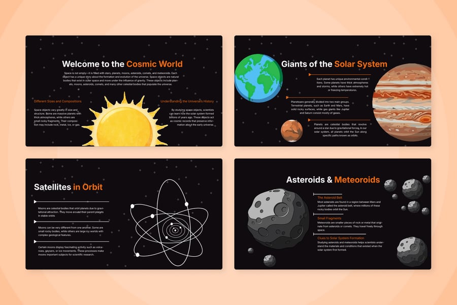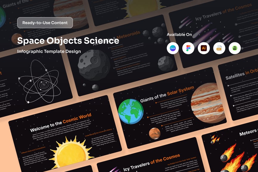 这幅宇宙与行星科学信息图旨在以现代教育方式,用视觉化的方式阐释宇宙的结构。它结合了行星插图、轨道图和科学图标,帮助观众以更直观、更引人入胜的方式理解各种宇宙天体之间的关系。简洁的深色太空背景画面,使信息呈现更加集中、专业。