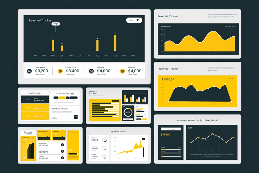 这款收入追踪信息图采用简洁现代的仪表盘式设计,用于可视化收入表现、财务增长和关键业务指标。该模板结构清晰,包含图表、图形、进度指示器和数据卡,有助于清晰高效地传达财务信息。采用专业的黄暗色调配色方案,支持清晰的数据层级和强烈的视觉对比。这款信息图完全可编辑且结构合理,可完美应用于财务报告、绩效分析和业务演示。