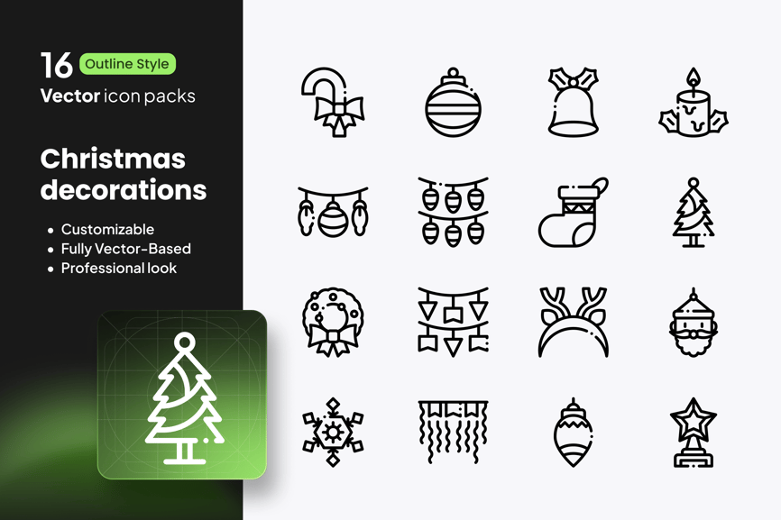 – 图标总数:16 个圣诞装饰图标(圣诞树、装饰球、彩灯、花环、圣诞袜、铃铛、花环、星星)