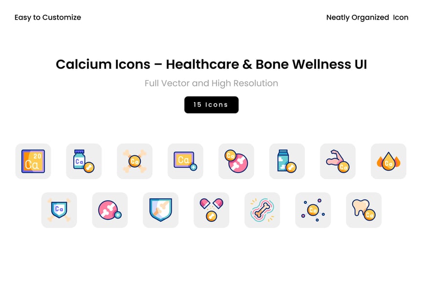 该系列产品包含多种健康符号,例如骨骼结构、营养补充剂瓶和牙齿。此外,还包括钙元素的科学图示、强度指标以及牛奶等营养来源。