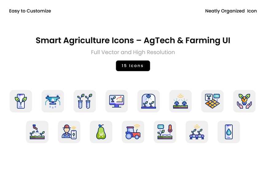 该系列图标包含各种高科技符号,例如监控无人机、自动拖拉机和智能温室传感器。它还包括用于现代食品生产的实验室植物测试、自动灌溉控制和数字水果质量扫描图标。