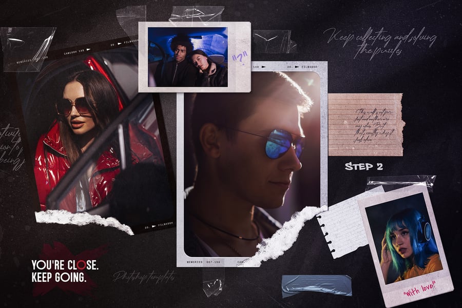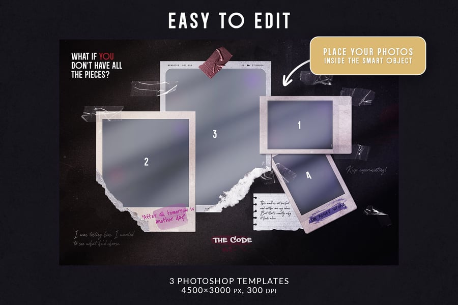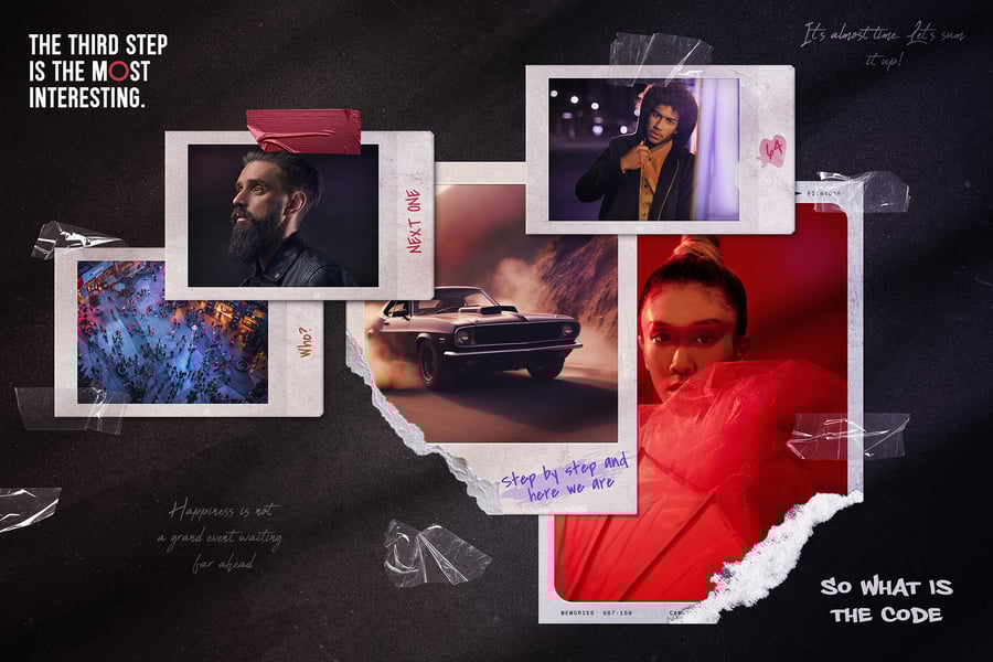 – 逼真的撕裂边缘:每个照片占位符都带有独特的、手工撕纸效果,营造自然质感。