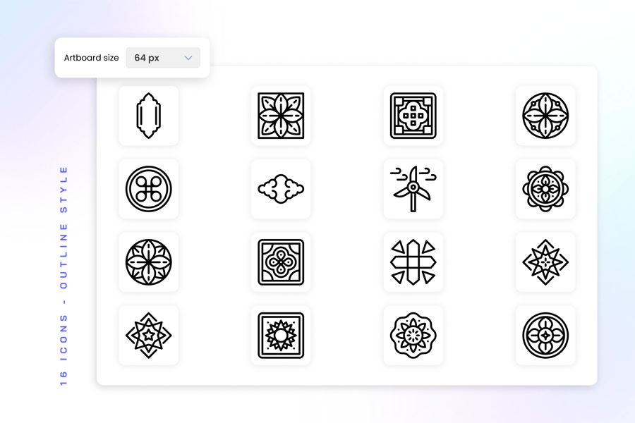 传统瓷砖轮廓图标集,包含 16 个简洁的矢量图标,代表经典的瓷砖图案、装饰元素和建筑设计。该系列包括几何图案、花卉图案、马赛克瓷砖、边框和装饰性设计,常用于室内设计应用程序、家居装饰项目、文化博客、社交媒体内容和建筑演示。