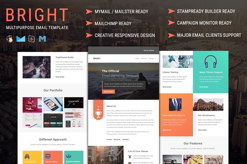 Bright 是一款多用途响应式电子邮件模板,适用于各种企业、办公室、商务、创意和通用类别。它包含一个电子邮件模板和一个 PSD 文件。