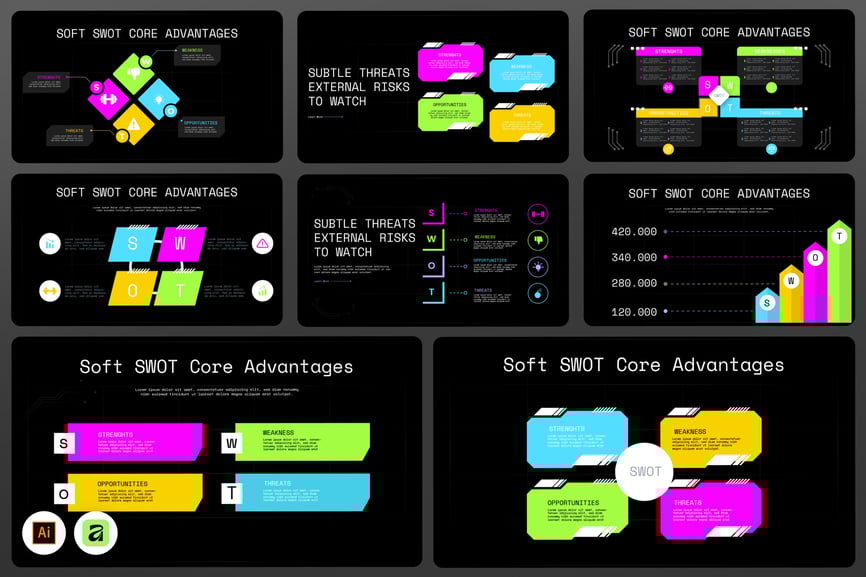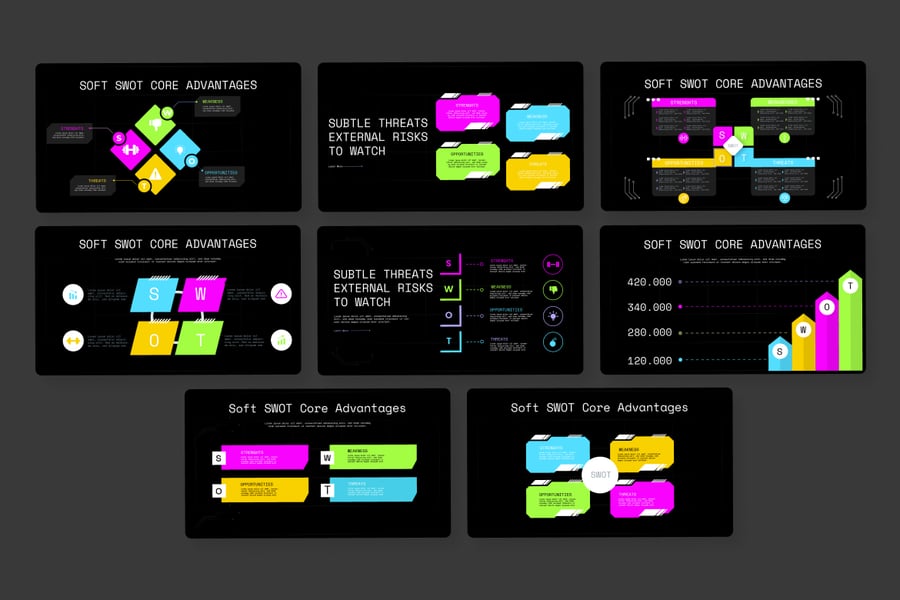 SWOT 分析信息图是一款现代深色主题的视觉模板,旨在以简洁明了的方式呈现优势、劣势、机会和威胁。该信息图采用霓虹色点缀、模块化 SWOT 模块、图表和对比元素,有助于将战略分析转化为清晰的视觉沟通。其布局支持用于商业、战略和决策演示的分析性叙事。