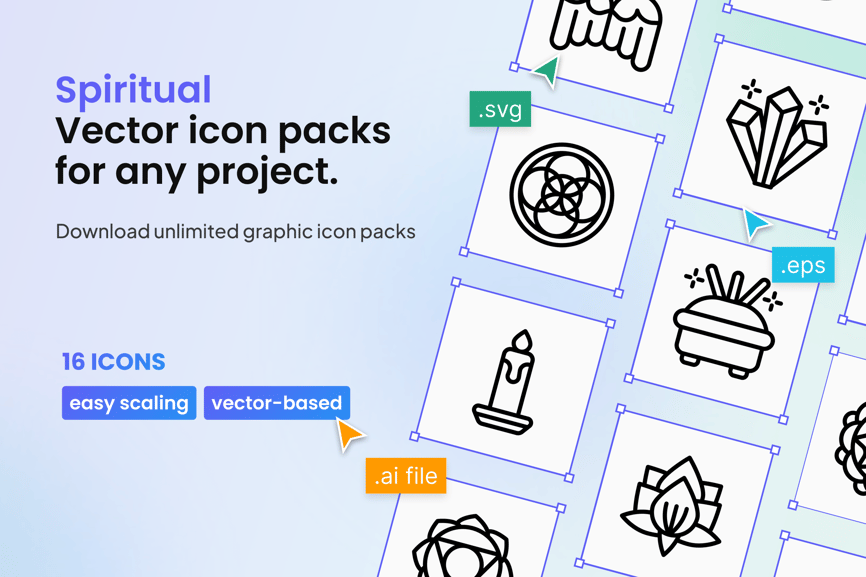 这套灵性主题图标集包含16个简洁的矢量图标,分别代表冥想、正念、神圣符号和个人成长。图标包括莲花、曼陀罗、冥想姿势、蜡烛、脉轮、念珠、神圣几何图形以及其他灵性符号,常用于健康类应用、博客、社交媒体内容、教育教程和冥想平台。