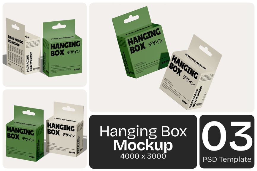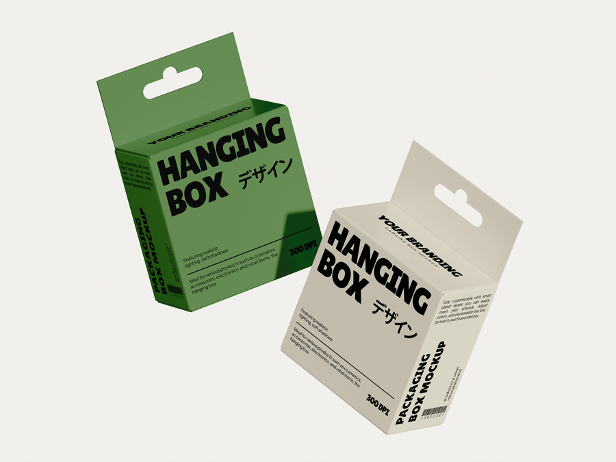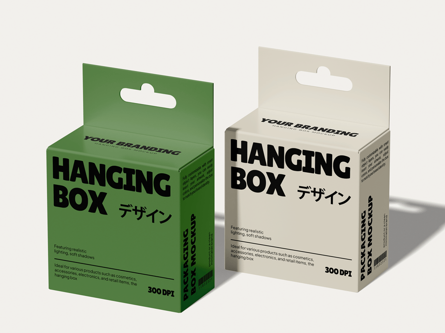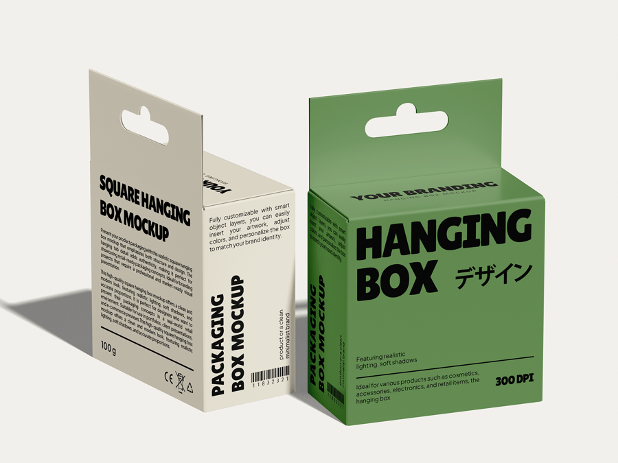 这款优雅的方形悬挂式包装盒样机,可用于展示您的礼品包装、零售产品包装盒和品牌悬挂展示架。智能对象图层覆盖包装盒的每个可见面板,让您能够以一致的透视和对齐方式应用全表面图案,而悬挂丝带和标签细节则进一步提升了高级开箱美感。