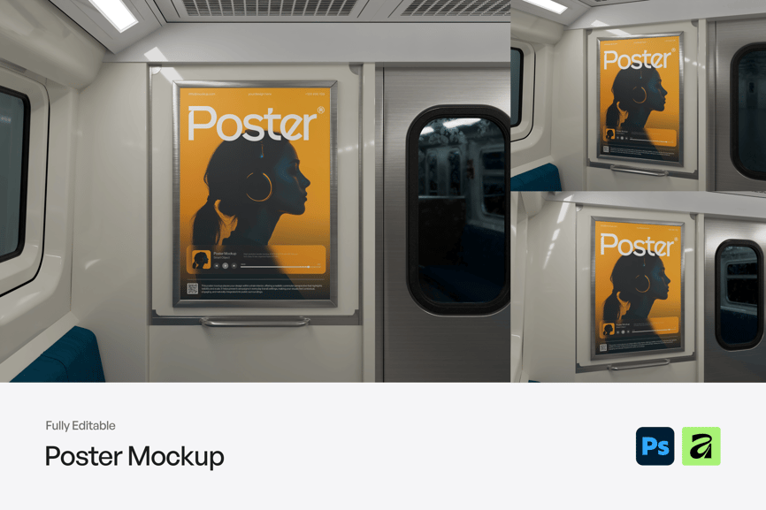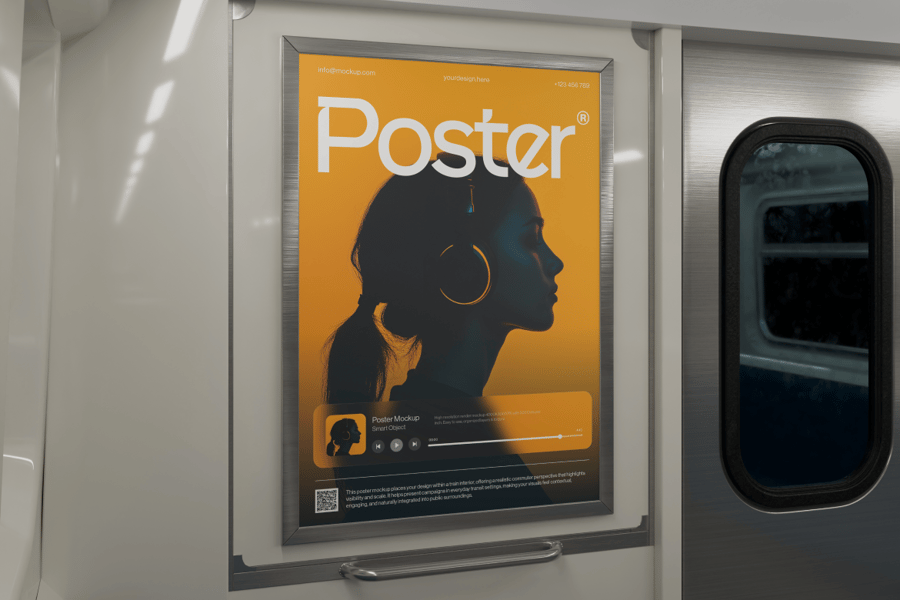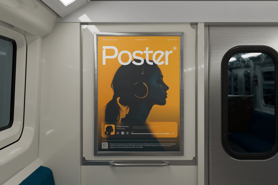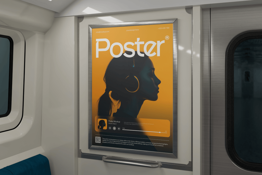 这款地铁车厢内部海报样机——逼真的广告展示场景,以一张主海报为中心,置于车厢内部,车门、车窗等周围元素巧妙地增强了真实感。布局以主海报为中心,确保您的品牌始终处于视觉焦点,同时又能融入都市故事背景。构图兼顾清晰度和环境氛围,使其成为户外广告牌预览和精致客户演示的理想之选。