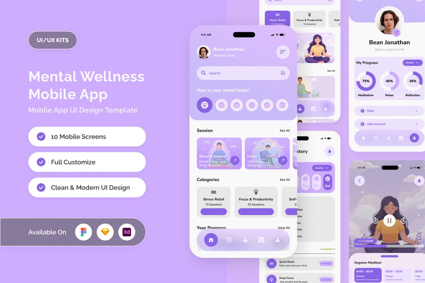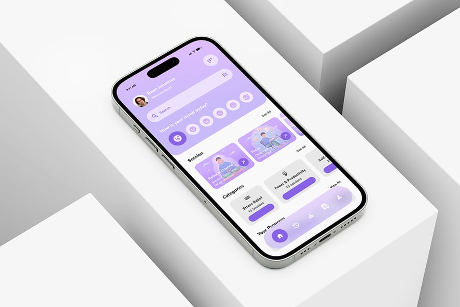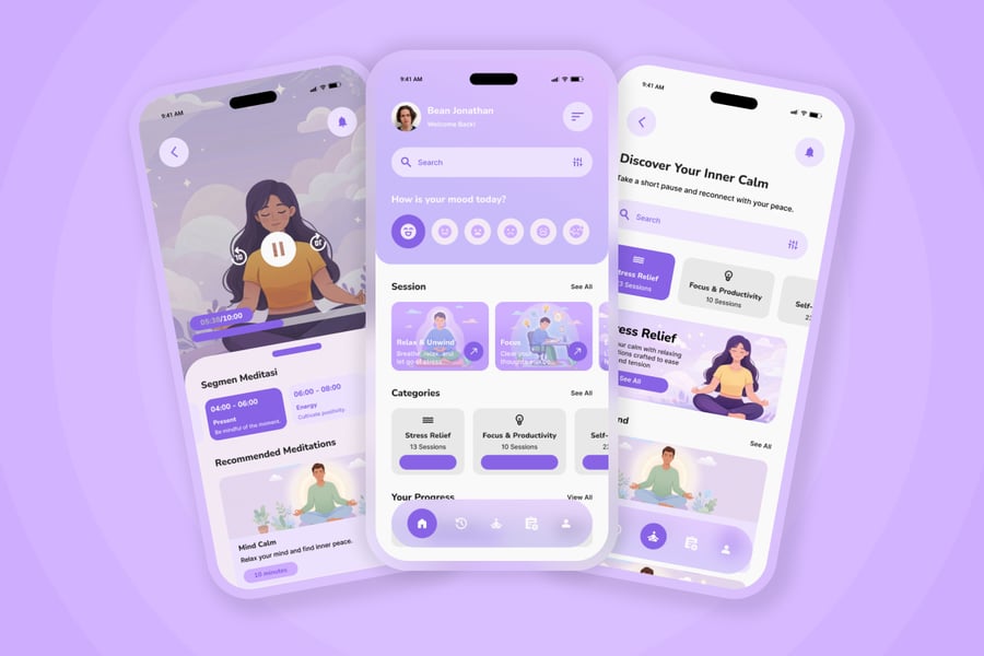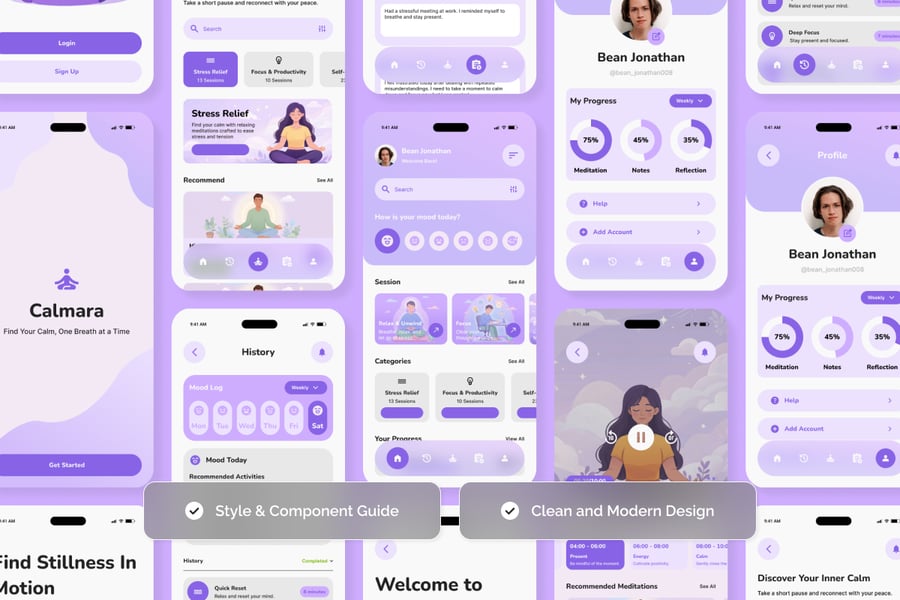 Calmara:平静身心健康与冥想 UI 套件提供了一个移动界面,旨在通过舒缓的数字化日常活动来培养正念和情绪平衡。它采用柔和自然的审美设计,将冥想和心理健康理念融入到温暖、轻盈且直观的界面中。每个视觉元素都经过精心打造,旨在最大限度地减少数字压力,创造更个性化、更平静的用户交互体验,符合现代健康标准。