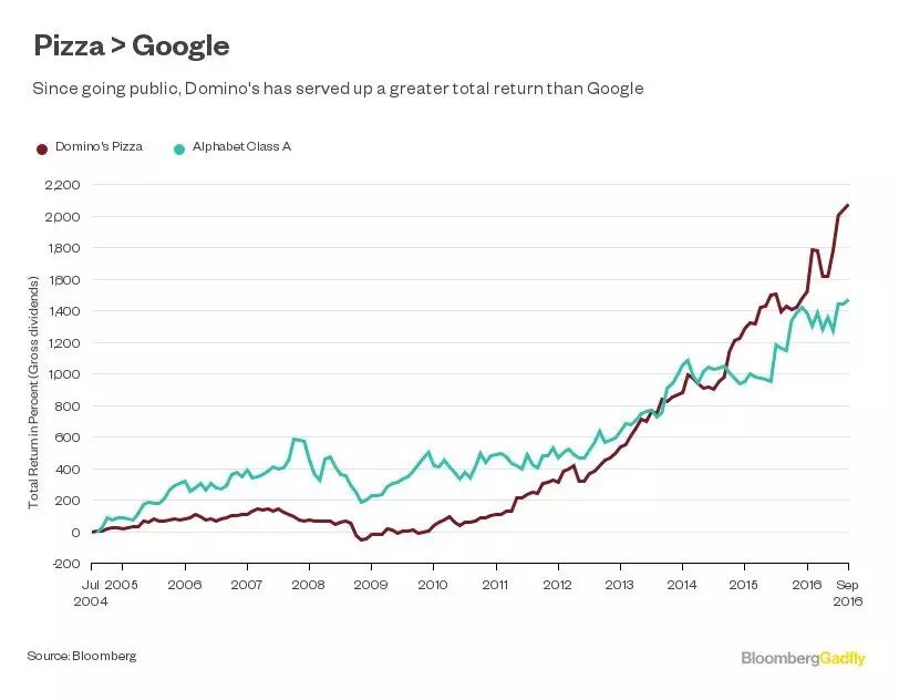 存活下来的公司共同点是敢于拥抱现代科技,为适应未来趋势不断改进服务和产品。以披萨行业为例。Pizza Hut已经主宰了这个行业多年,Domino’s紧随其后。然而,情况开始转变。Pizza Hut的关键财务指标正在下降,而Domino’s的总股息回报正在迅猛增长(增长指数甚至超过Google!)。