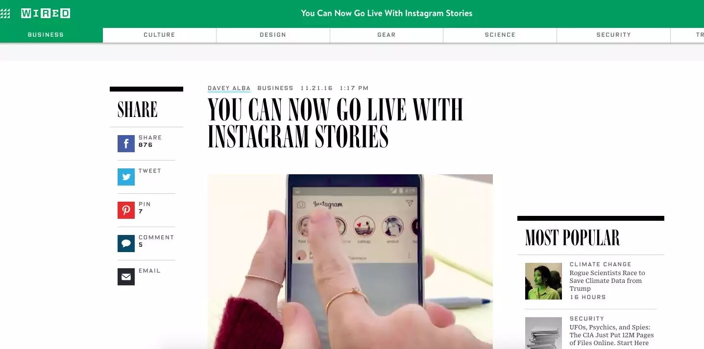 这一年社交媒体平台在视频直播上做文章。Instagram发布了Instagram Stories and Live,而Twitter推出了NFL球赛和其他大型活动的现场直播。Facebook除了在主导航添加了“视频”新标签,还推出了Facebook直播和视频广告。(当Facebook加上“视频”重新设计整个导航时,视频直播这一趋势势不可挡。)