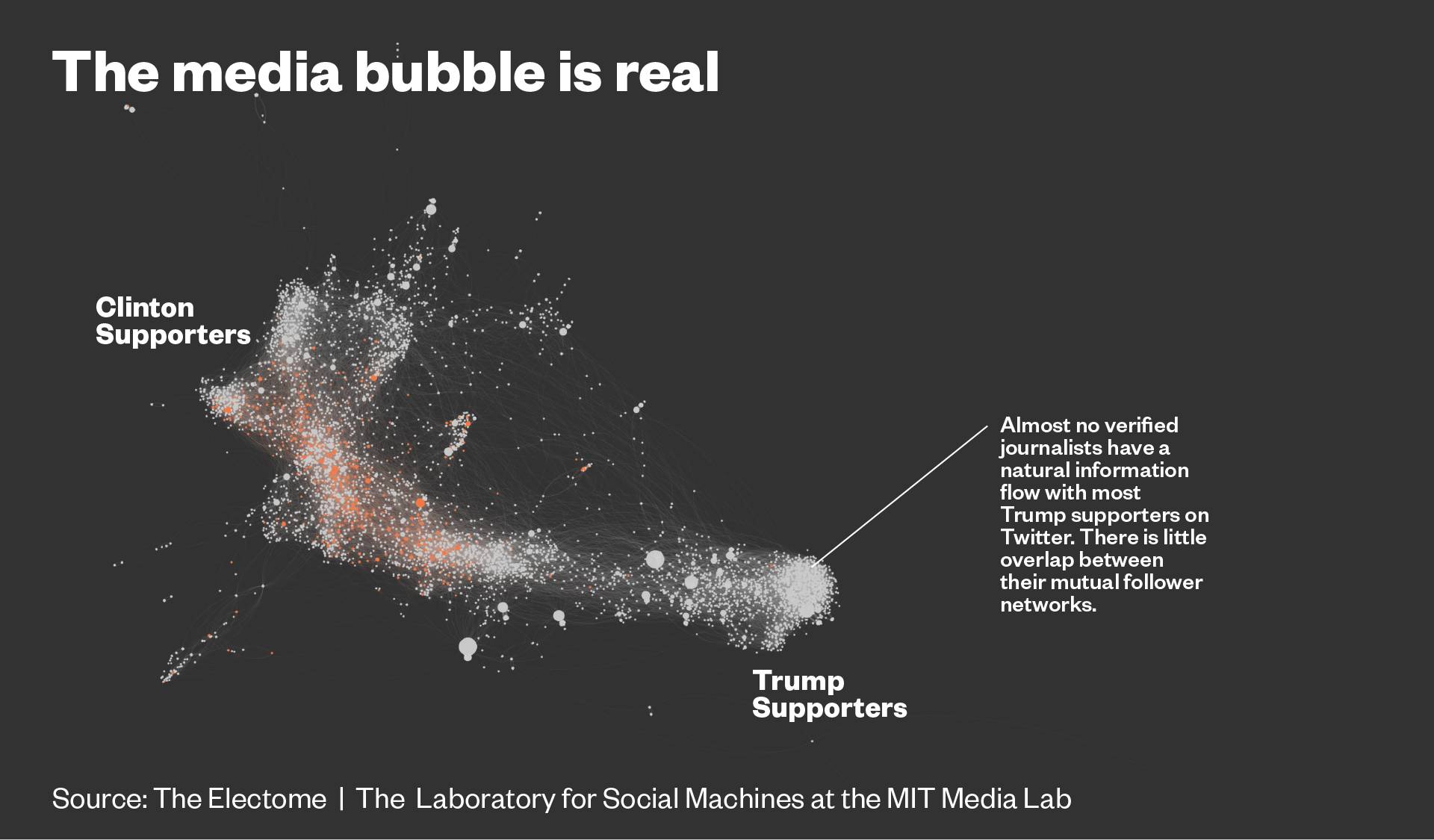 无论你站在哪个党派的一边,我们都不能忽视回声室现象如何影响了这次总统竞选。在社交媒体上,我们会点赞跟我们的想法一致的内容,被那些具有同样想法的人吸引。但从2016年总统大选中可以看出,许多美国人生活在一个在线泡沫圈中,这次竞选也是选举史上最出人意料的结果 – 甚至对于那些持续跟踪报道一年多的记者。